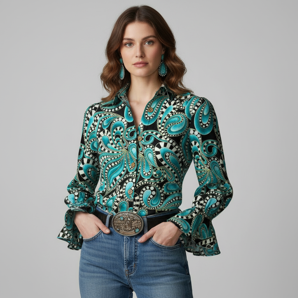 This button-up shirt is a visual celebration—where Western charm meets bold, baroque-inspired patterning. With its tailored fit and intricate mix of swirls, checks, and paisley-like flourishes, it’s designed to stand out in the saddle or on the street. Finished with classic cuffs and a crisp collar, it’s a go-to for statement layering.