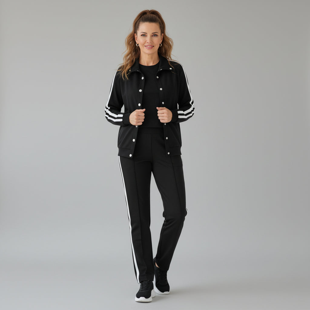 This coordinated 3-piece set blends sporty edge with everyday ease. Featuring a sleeveless top, matching pants with side stripes, and a zip-up jacket to layer or carry, it’s designed for movement, versatility, and impact. Whether styled together or worn separately, each piece delivers comfort with a bold finish.